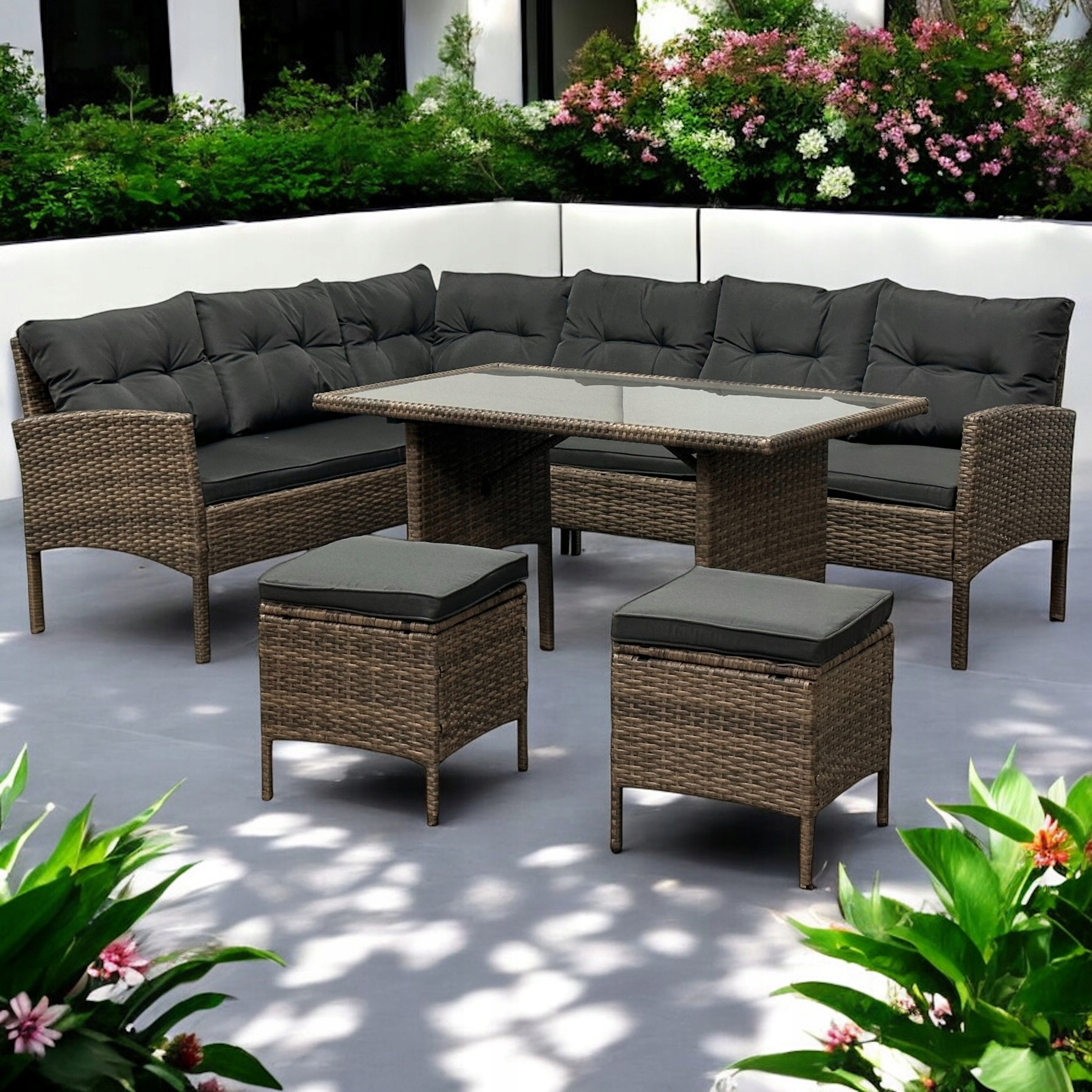 ✔️ Stwórz stylową i wygodną przestrzeń wypoczynkową w swoim ogrodzie lub na tarasie dzięki dużemu zestawowi mebli ogrodowych w eleganckim brązowym kolorze z ciemnymi poduszkami.